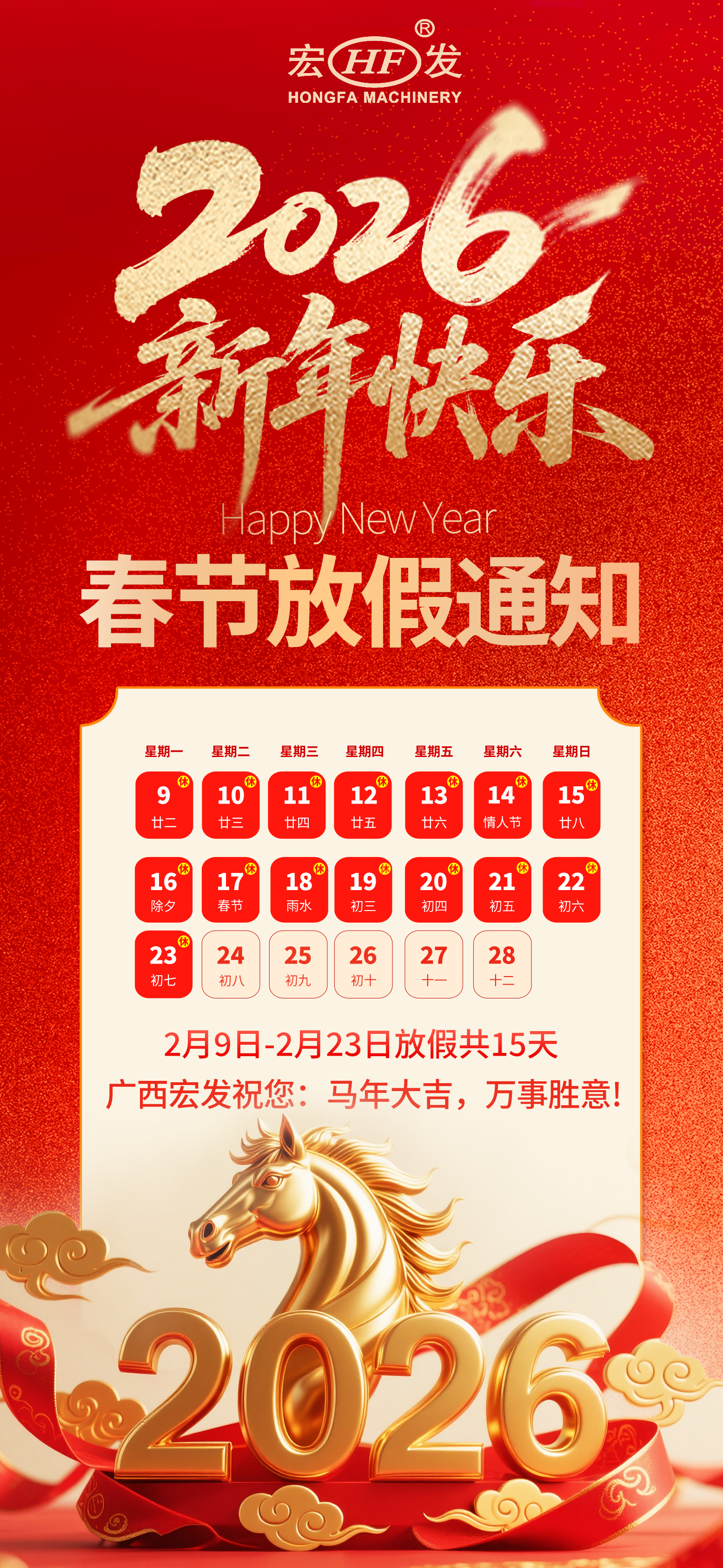 金馬昂首,萬象啟新!值此馬年新春佳節(jié)來臨之際,宏發(fā)重工向一年來辛勤付出的員工、長期信賴支持我們的客戶及合作伙伴們,致以最誠摯的感謝和最美好的祝福!
